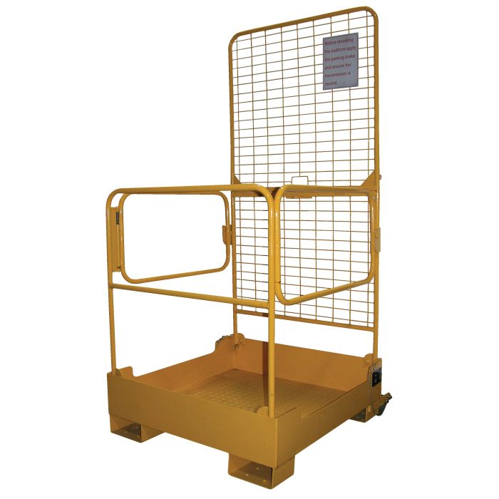 Elevate personnel to overhead racks and shelving for safe, convenient access. When not in use, unit can be folded down and moved out of the way by just one person. Unit stores conveniently in a 4" deep bottom base, with an overall height of 11-9/16". 38" high handrail with 231⁄2" high mid-rail on three sides. 60" high expanded metal backing on fourth side. Includes checker floor plate platform, tine lock and 36" long chain with hook to attach platform to fork truck. Usable fork pockets measure 7-3/4"W x 3-7/8"L on 26" centers. Powder coat yellow finish. Steel construction.