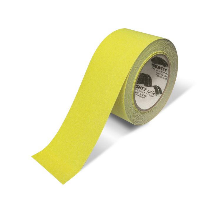 Yellow Mighty Line Anti Slip Floor Tape is 2" wide by 60' long. This tape is 25 MIL thick with a peel and stick, adhesive backing. This tape does not leave any residue during removal. To apply the tape, peel the liner off and stick it to a clean, dry surface. There is no wait time, industrial wheel traffic can continue immediately. This anti slip tape can be applied to wood, metal, and concrete. This tape has an industrial strength adhesive.