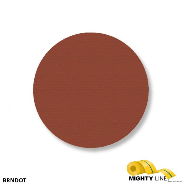 Brown Mighty Line Floor Dots, 3.5" wide, pack of 100. These Mighty Line dots are a great floor marking tool. Often, dots are used at dock doors to create a line. Users also build curved lines on their floor with the Mighty Line floor dots. Dots are highly recommended when forklifts are constantly dragging skids. These floor dots do not leave residue when you remove. To apply the dots, peel and stick the adhesive backing to a clean area of the floor.