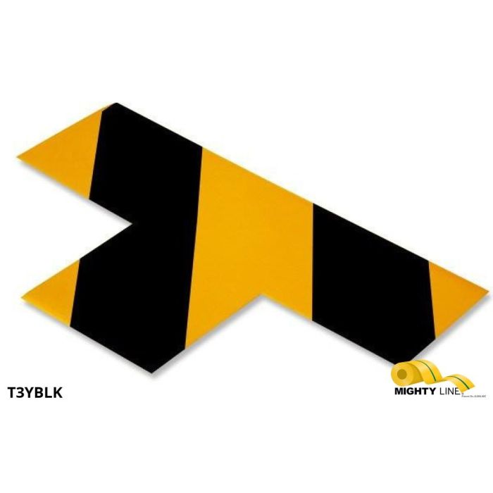 Yellow and Black Mighty Line Floor Tape Ts, 9"x6"x3", pack of 100. These Ts are powerful floor marking tool. The beveled edge and 50 MIL thickness of the floor tape helps to withstand industrial traffic for a warrantied 3 years. The Ts do not leave residue upon removal. The patented floor marking material can be used to mark off areas on your floor. These T shapes help to keep inventory, tools, and workers organized.