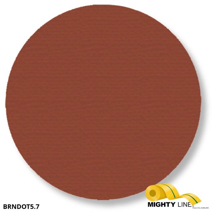 Brown Mighty Line Floor Dots, 5.7" wide, pack of 100. These Mighty Line dots are a great floor marking tool. Often, dots are used at dock doors to create a line. Users also build curved lines on their floor with the Mighty Line floor dots. Dots are highly recommended when forklifts are constantly dragging skids. These floor dots do not leave residue when you remove. To apply the dots, peel and stick the adhesive backing to a clean area of the floor.