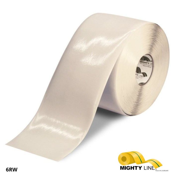 White Mighty Line Floor Tape is 6" wide by 100' long. This tape is 50 MIL thick PVC material with a peel and stick, adhesive backing. This tape does not leave any residue during removal. To apply the tape, peel the liner off and stick it to a clean, dry surface and the tape is warrantied to stay down for 3 years. There is no wait time, industrial wheel traffic can continue immediately. The beveled edges allow the tape to withstand constant traffic. This tape is as thick as two credit cards and it is meant to replace the use of paint and thinner tapes within the warehouse. This product is patented.