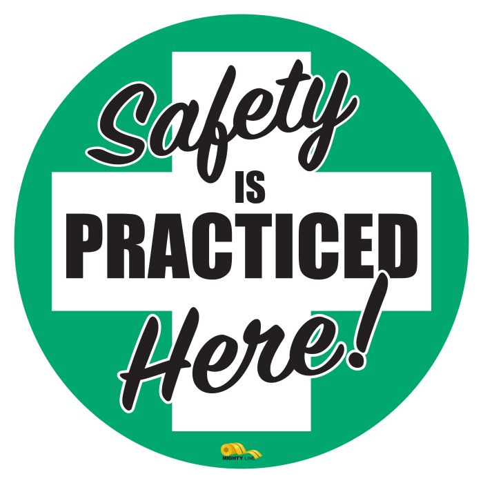 Safety Is Practiced , Mighty Line Floor Sign, Industrial Strength, 12" Wide. Mighty Line safety floor signs are a great floor marking tool. Mighty Line floor signs are perfect solutions for 5s facilities, lean operations, and for warehouse safety.